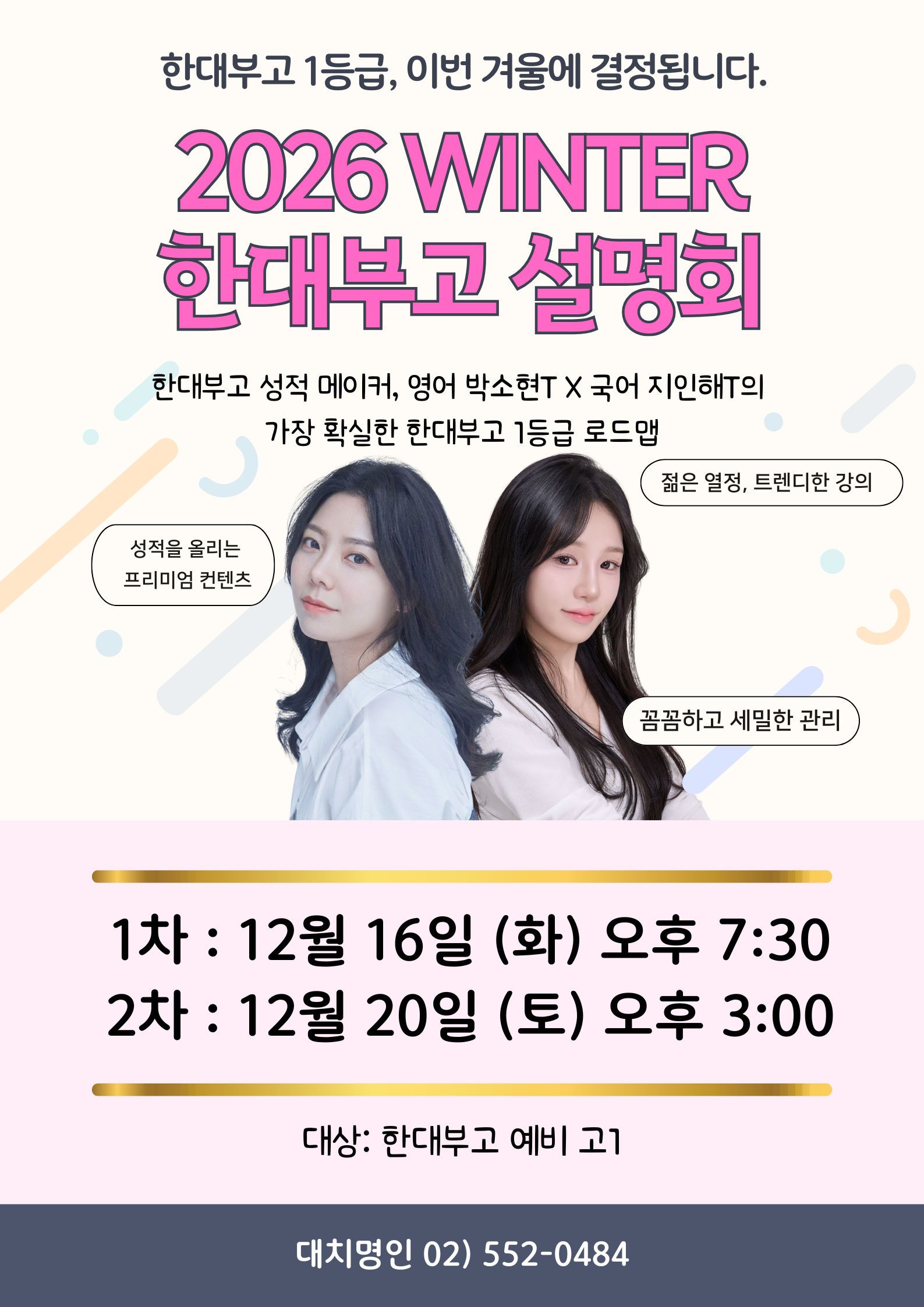 설명회 BRIEFING 온라인 설명회 오프라인 설명회 대치캠퍼스 [12/16(화) pm 7:30] ★한대부고 입학생★ 설명회 일시 : 2025/12/16(화) PM 7:30 장소 : 명인학원 2층 설명회 진행여부 : 마감 설명회 신청 설명회 신청 조회 설명회 목록보기